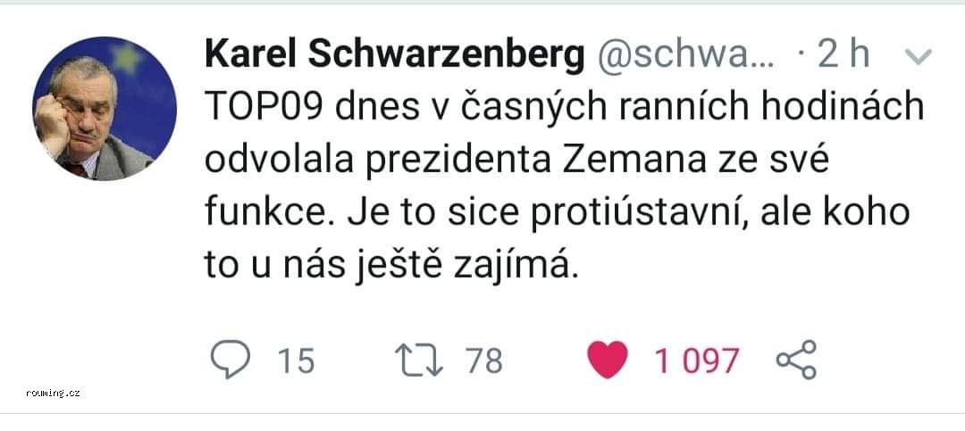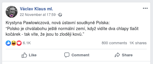 Obžalovaný Zuckerbergu, odsuzujete se k nepodmíněnému trestu odnětí svobody v tří let za to, že jste panu Václavu Klausovi mladšímu, dále jen poškozený, smazal z Facebooku ty jeho píčoviny.