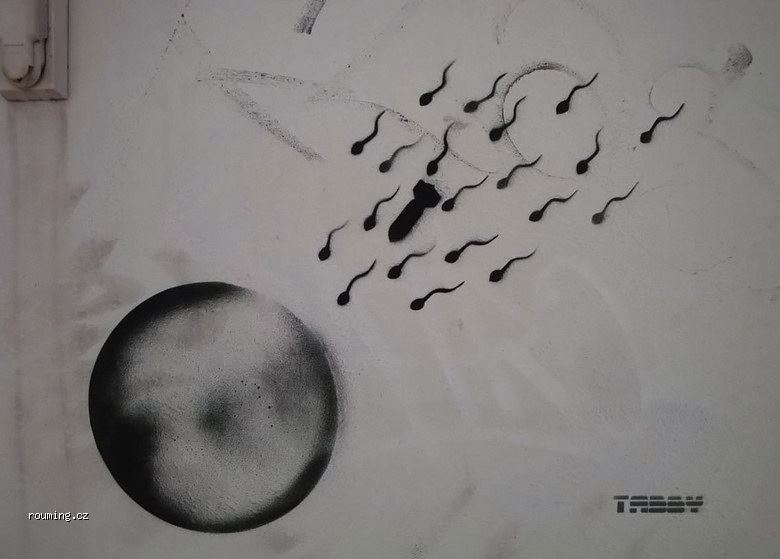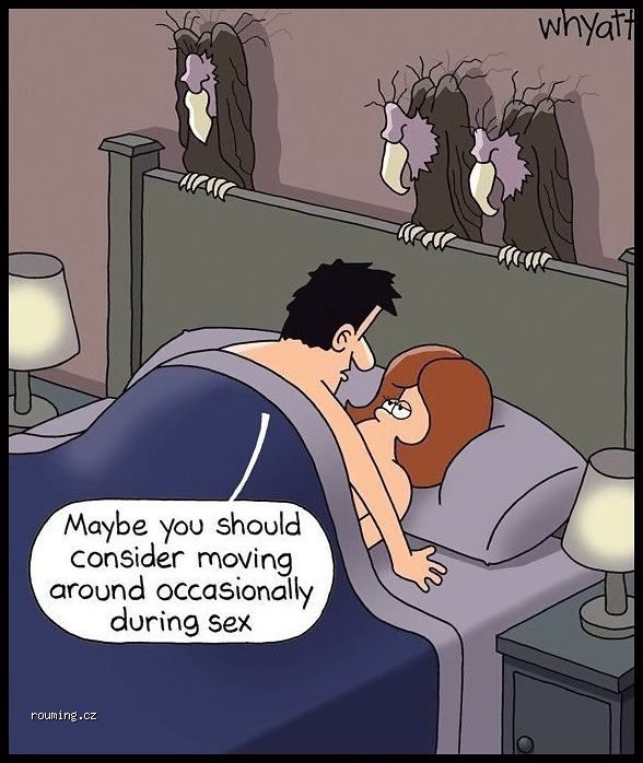 Leží nahá ženská na posteli a mezi nohama má nablito. Vedle postele klečí chlap a zvrací.